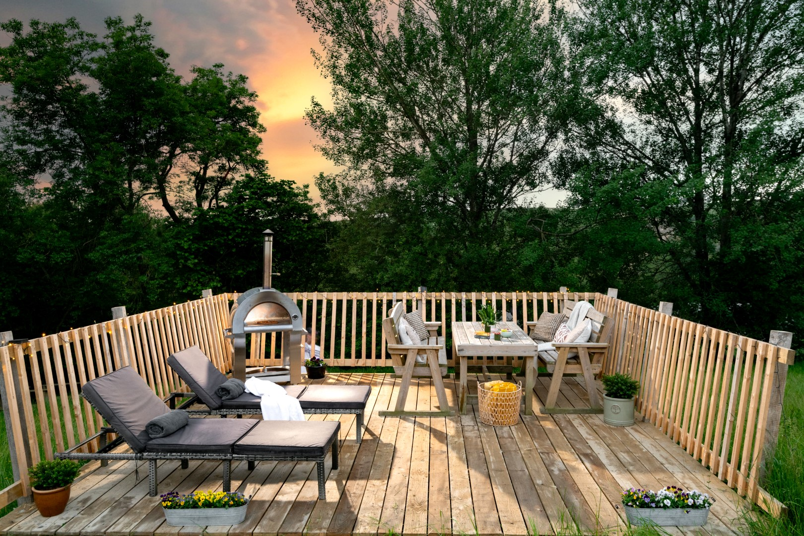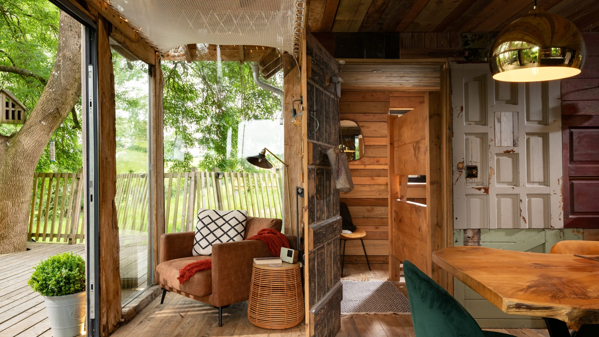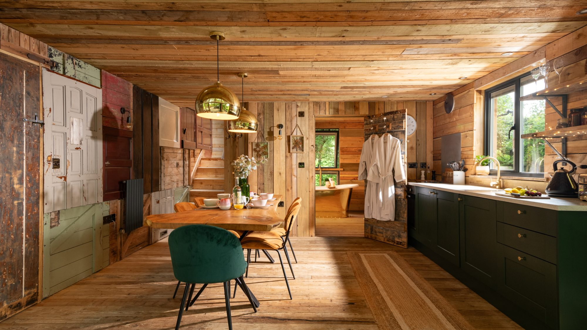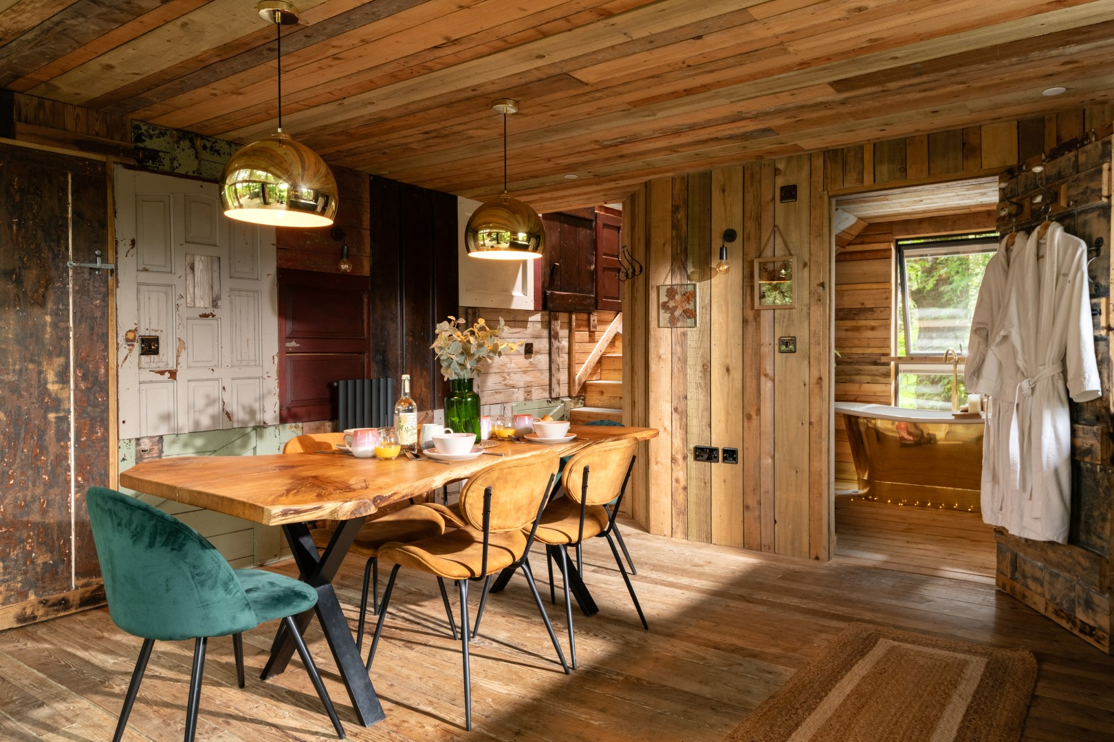Inside, the space envelops you in warmth and considered comfort. A generous king-size loft bed looks out across the landscape, while underfloor heating, plush robes, and softly layered lighting create a tranquil, spa-like ambience. Copper accents, fine linens, and handcrafted timber details introduce a sense of rustic elegance — every element thoughtfully composed for slow mornings, restorative sleep, and moments meant to be lingered over.