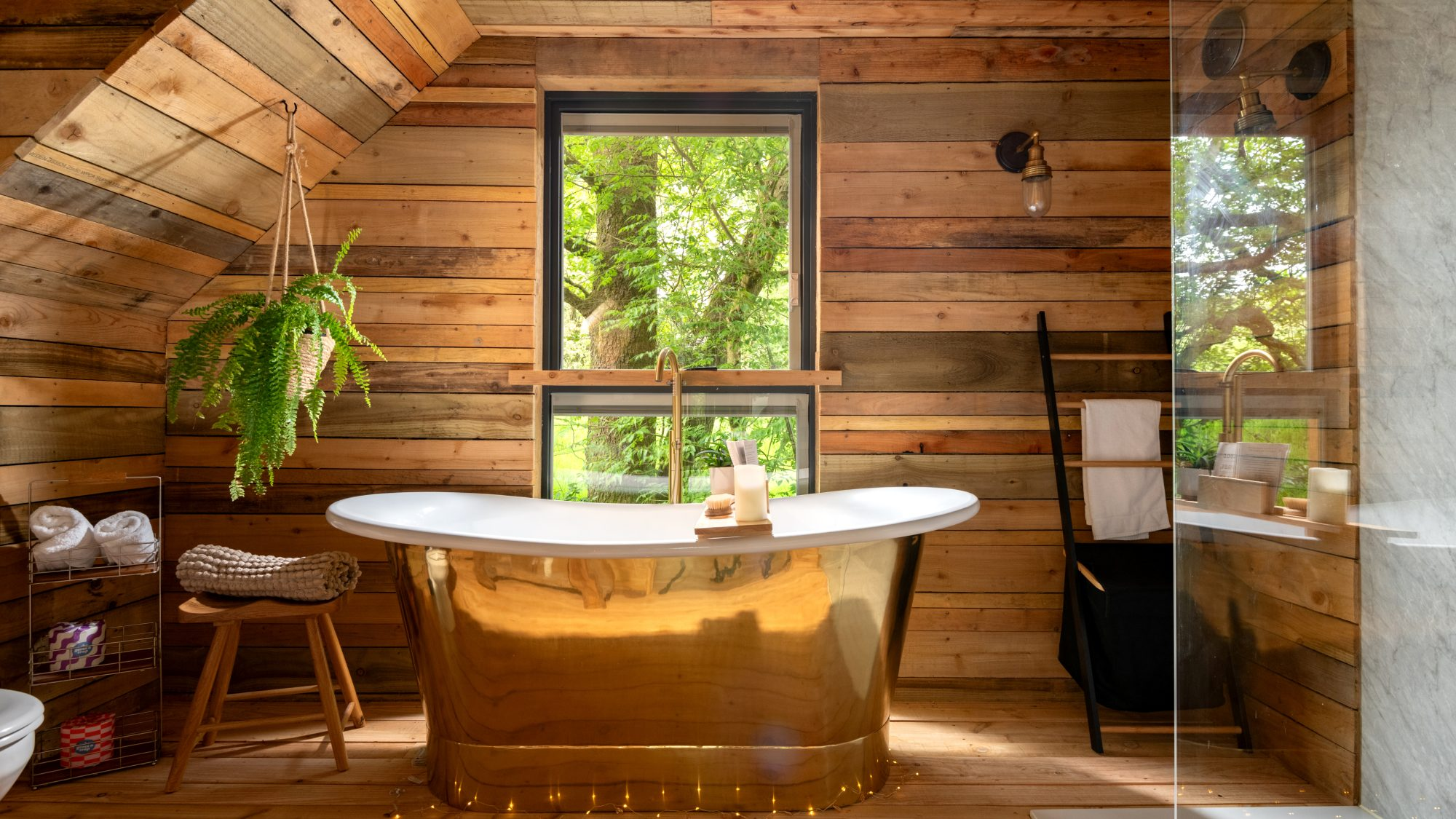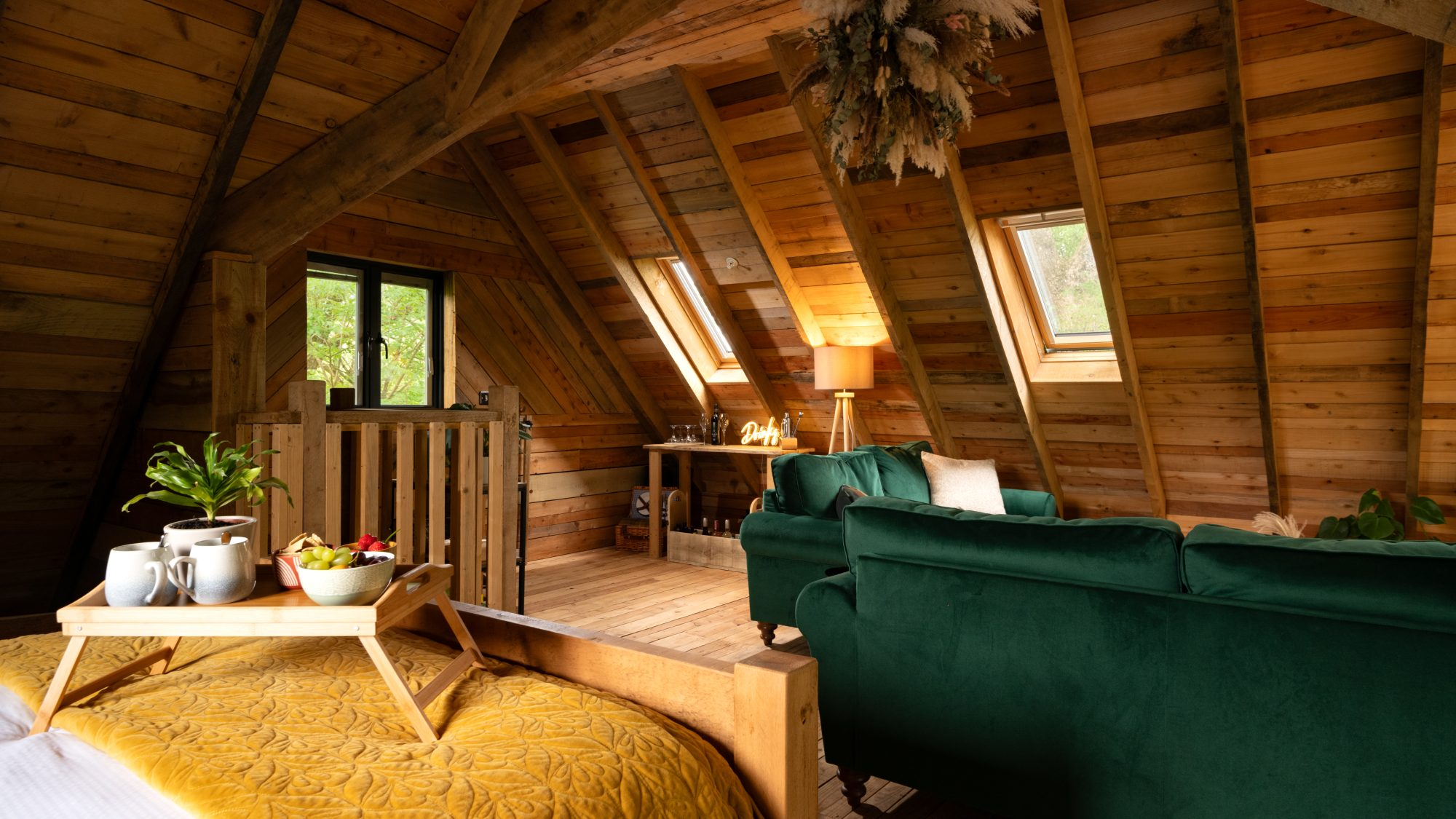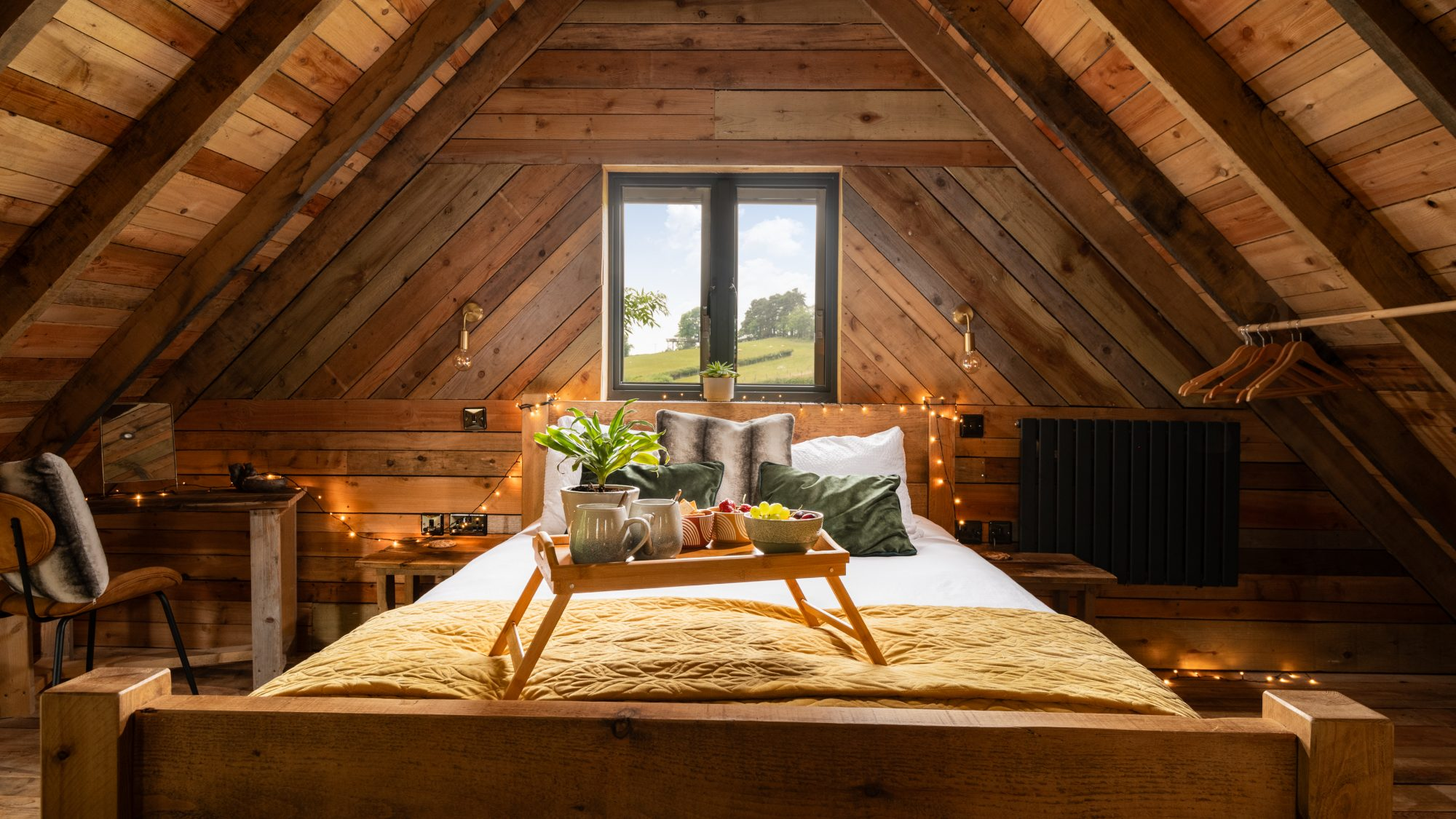 Inside, the space envelops you in warmth and considered comfort. A generous king-size loft bed looks out across the landscape, while underfloor heating, plush robes, and softly layered lighting create a tranquil, spa-like ambience. Copper accents, fine linens, and handcrafted timber details introduce a sense of rustic elegance — every element thoughtfully composed for slow mornings, restorative sleep, and moments meant to be lingered over.