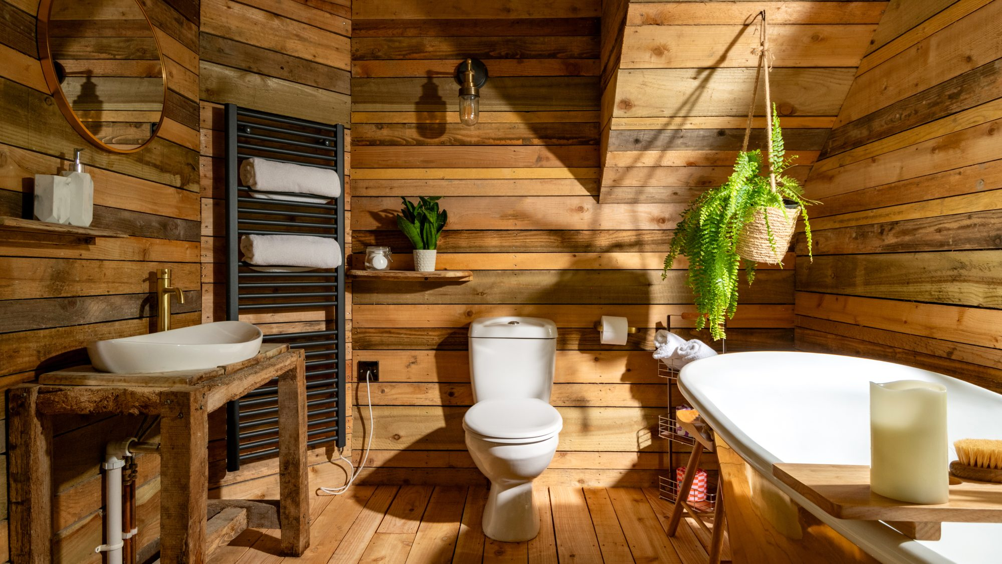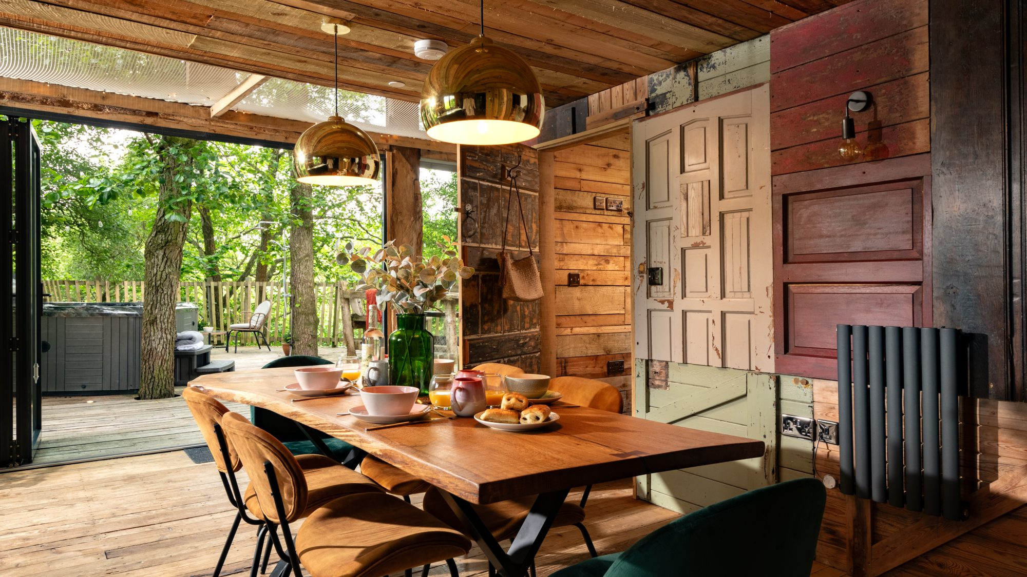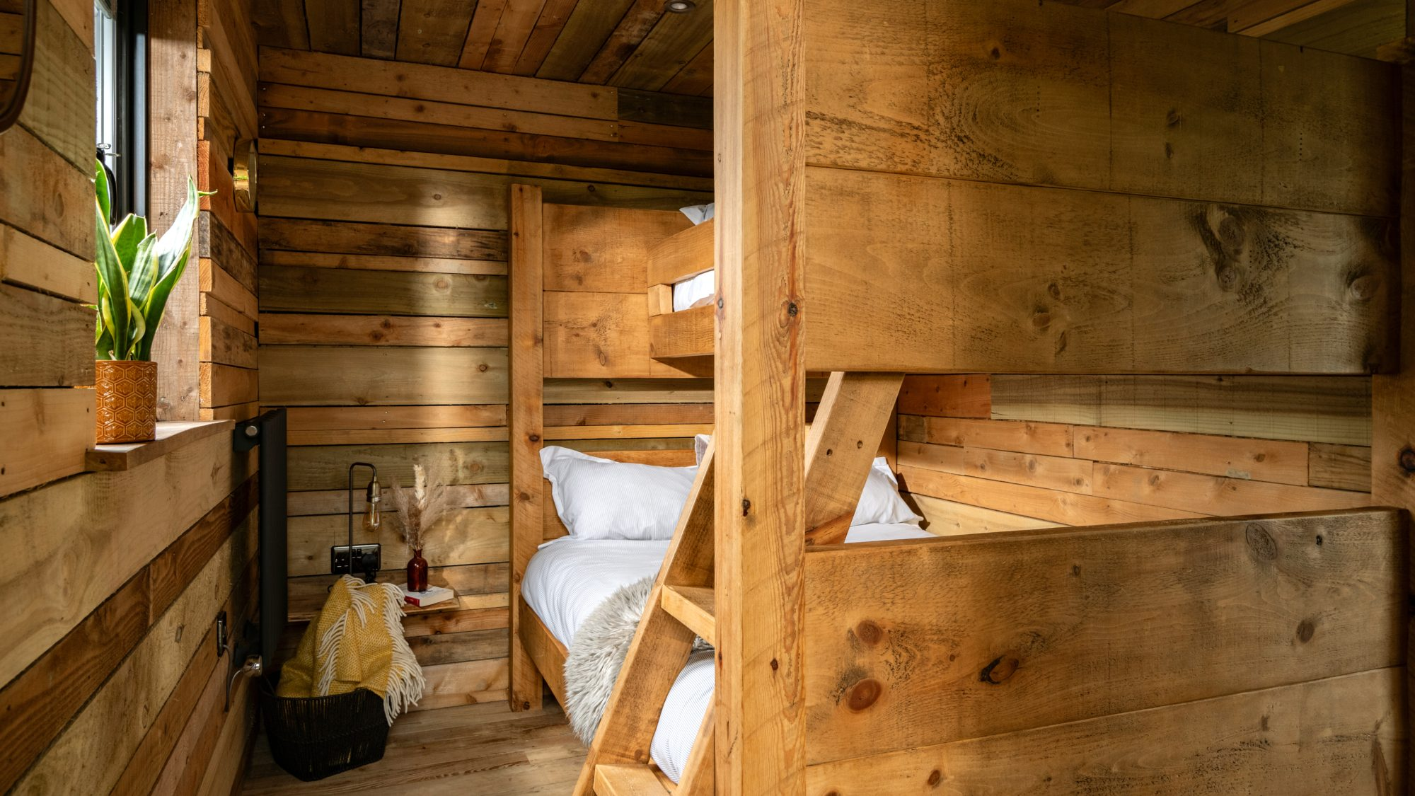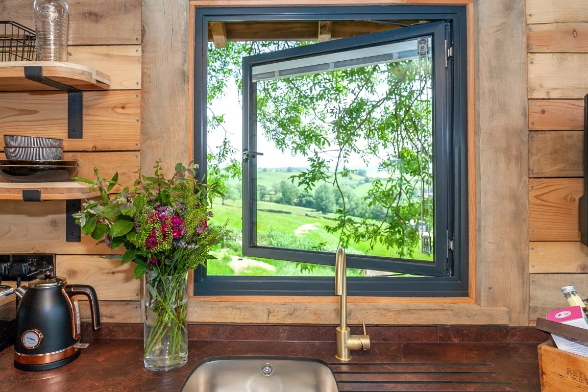 Inside, the space envelops you in warmth and considered comfort. A generous king-size loft bed looks out across the landscape, while underfloor heating, plush robes, and softly layered lighting create a tranquil, spa-like ambience. Copper accents, fine linens, and handcrafted timber details introduce a sense of rustic elegance — every element thoughtfully composed for slow mornings, restorative sleep, and moments meant to be lingered over.